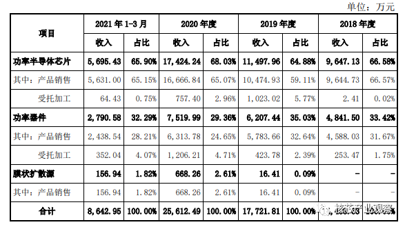 超六成营收来自功率半导体芯片业务。安芯电子的主营业务主要分为功率半导体芯片、功率器件和膜状扩散源三大模块,2020年分别实现销售收入的是1.74亿元、0.75亿元、0.07亿元,占总营收的比例为68.03%、29.36%、2.61%。