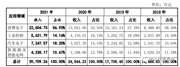 消费电子、工业控制是安芯电子最大的应用领域,但是随近年消费电子市场进入疲软周期,下游应用需求放缓,安芯电子在这两大领域的收入占比在逐年降低。