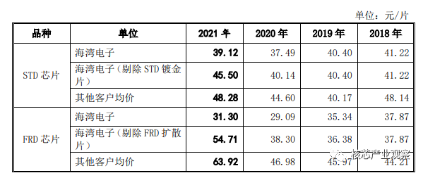 另外,海湾电子从2019年开始替代锦荃电子,成为安芯电子的第二大客户。2018年-2021年,安芯电子向海湾电子销售金额分别为202.72万元、1550.46 万元、2174.22万元和 2567.88 万元,收入金额呈逐年增长态势。这个客户的芯片业务销售收入2019年度增涨最多,而器件业务则是2020年增涨最多。随着海湾电子的采购规模在快速扩大,安芯电子在产品价格上给予了一定优惠。