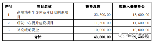 安芯电子此次上市募资,拟3.95亿元投入 “高端功率半导体芯片研发制造项目”、“研发中心提升建设项目, , ”。其中高端功率半导体芯片研发制造项目总投资金额高达2.23亿元,拟投入募集资金1.8亿元,为安芯电子此次投资金额最高的募投项目。
